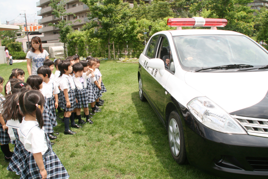 最後に、園庭でパトカーを見学し、大きなサイレンの音に驚いたり目を丸くしたりしながら、教室を通して交通安全に対する意識を高めてくれた様子でした。