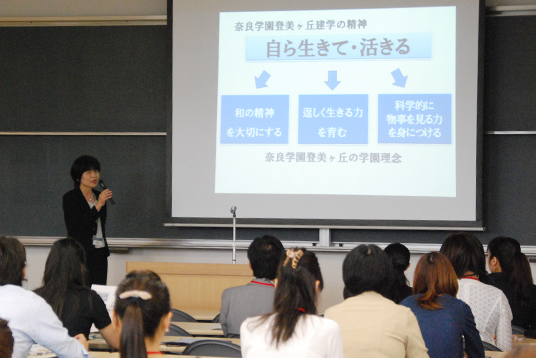 初めに奈良学園登美ヶ丘教育総括監・中学校・高等学校の古川校長が挨拶に立ち、奈良学園登美ヶ丘について、「幼稚園から高等学校までを擁し、約1000人が暮らす、安心・安全な街。幅広い学齢の生徒と職員の交流により豊かな人間性を育む環境です」と語りました。