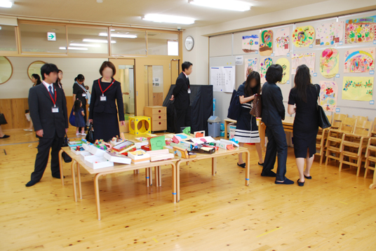 最後に今後の入試の日程等について説明があり終了しました。その後、希望者の方に幼稚園の園舎を見学していただきました。 この日はあいにくの雨となりましたが、開放感のある教室と展示された園児の作品をご覧になり、保護者の方とお子様も期待に胸をふくらませるご様子でした。 また、荒井園長と島野教頭が個別に相談に応じ、幼稚園についてより深くご理解いただけたことと思われます。