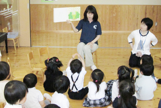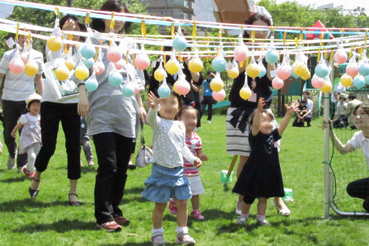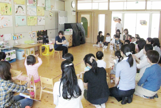受け付けを済ませた後、しばらくの間、おもちゃなどで自由に遊び、その後、青々とした園庭の芝生で、親子で体操をしたりかけっこをしたりして楽しんでいただきました。子どもたちは、競技の中では、はちきれそうなほどの笑顔で走り、おみやげを手に入れて大満足のようでした。また保育室では先生に絵本や紙芝居を読んでもらって、お話しの世界にもひたっていました。
