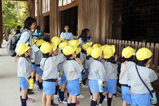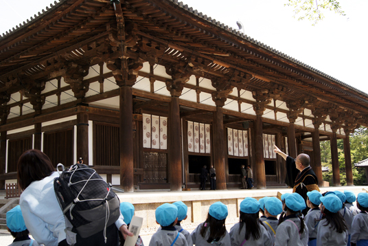続いて全員で金堂の本尊・蘆舎那仏坐像や脇侍の仏様を見学しました。「耳が大きいね」「たくさんお話聞いてくれるかな?」「何を持っているのかな?」と、みんなで考えたり、講堂では「弥勒如来像の両側にいる仏様は誰?」「背中の炎みたいな物は何?」と園児たちは不思議に感じたことを積極的に質問したりしていました。