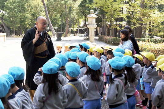 山門では西山明彦(みょうげん)執事長が出迎えてくださり、国宝の金堂に案内していただきました。そして大屋根を支えている『隅鬼』を示して、「この鬼たちは、お寺に悪者がやってきて建物を燃やしたり壊したりしないように1250年もの間、守ってくれている良い鬼です。来年の豆まきの時には心の中で『良い鬼さんはうちにおいで』と願ってあげてくださいね」と話してくださり、園児たちと約束をしました。