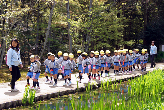 その後、園児たちは静かな境内を観光客やお寺の方にきちんと挨拶しながら、先生と一緒に地図を参考にして探検し、ツツジや藤、椿、苔など知っている植物を見つけるなどして、春の遠足を楽しみました。