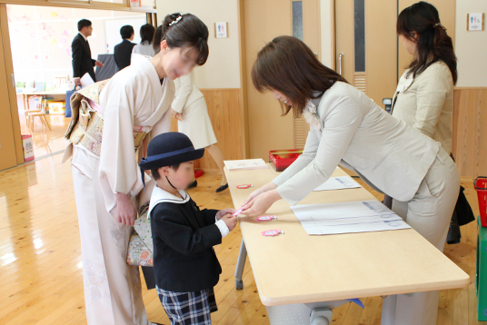 続いて、西川彭理事長が園児たちの前に行き目線を合わせながら話しかけると、元気に返事をする園児の姿が見られました。そして、保護者に「みんなで一緒に子育てをしたいと思います」と入園を祝福しました。