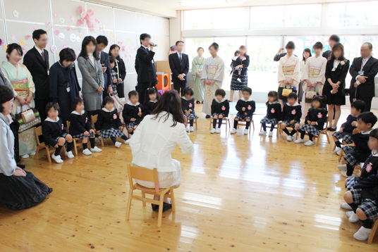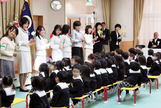 教職員を紹介した後、全員で「チューリップ」の歌と園歌を歌い、会場全体が優しい雰囲気に包まれながら閉式しました。