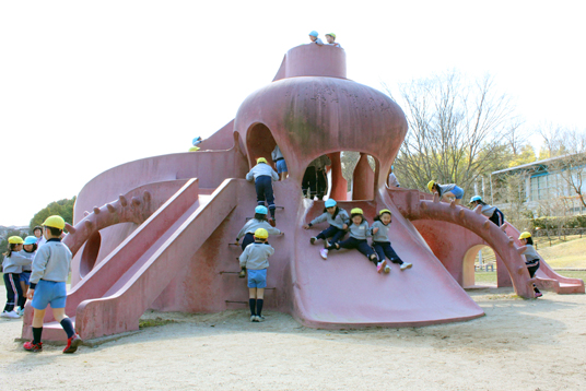 大渕池公園へ卒園遠足に出かけました 2011.03.04(金) Post 春寒も緩み穏やかな晴天に恵まれた4日、卒園を控えた年長組が、園から徒歩約30分のところにある大渕池公園(東地区)=通称・タコ公園=へ、卒園遠足に出かけました。園児たちは軽やかな足取りでタコ公園に到着すると、タコの姿をした滑り台の遊具に大はしゃぎで、急傾斜やカーブを描く滑り台を何回も滑り下り、周辺は子どもたちの大歓声に包まれていました。また、海賊船を思わせるミニアスレチックも大人気で、つり橋のように揺れる丸太の橋を渡ったり、ロープ風のジャングルジムをよじのぼって鐘を鳴らしたり、かけっこも楽しんでいました。また、公園の草木や木々から春を探したりおやつも食べたり元気いっぱいに遊びました。このタコ公園は、年中組の時にも皆で訪れた公園で、卒園前の楽しい思い出となった様子でした。 « 雛祭りの会を開きました 第2回体験入園を行いました »