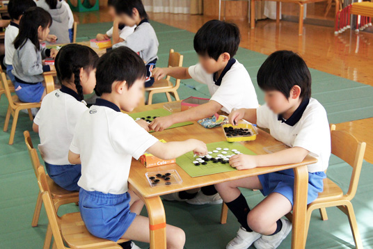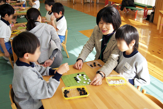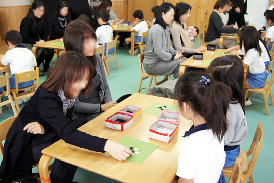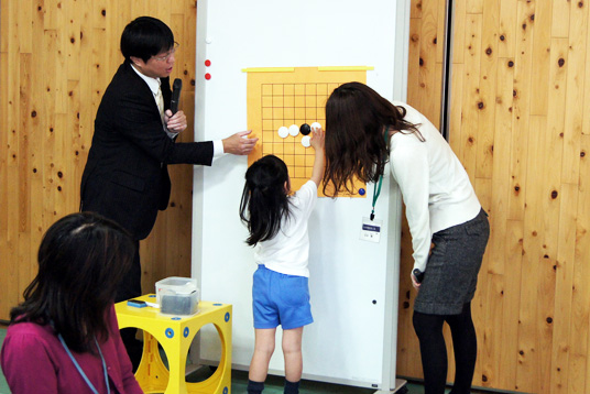 年長組の園児は昨年経験していることもあり、石の置き方や取り方など基本的な説明を受けた後、石井茜初段やアシスタントの栗生直樹さんに教わりながら保護者の方と一緒に対局を楽しみました。中でも課外講座で囲碁を学んでいる園児の碁打ちは、先生方もうなるほどの腕前で真剣に一手を考える姿が見られました。 続いて年少組や年中組の園児も、「どこに置けるかな?」「逃げ道をふさいでみよう」とわかりやすくルールを教えていただき、簡単な『石取り』を楽しみました。