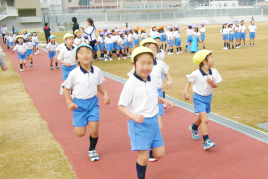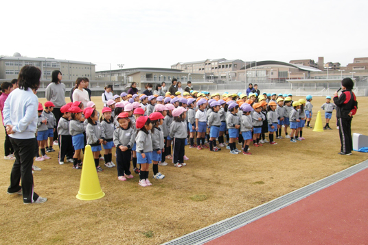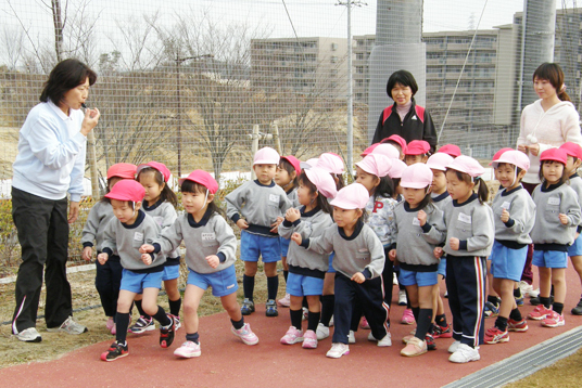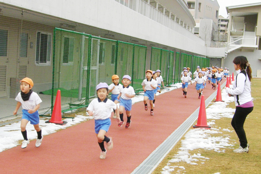 年少組はグラウンド1周、年中組は1周半、年長組は2周をそれぞれ走ります。自分が走っていない時も、「がんばれ、がんばれ!」とお友達を一生懸命応援します。つまずいてしまったり、息が切れたりと、決して楽ではなかったはずの園児たちですが、ゴールを迎える時はみんな、寒さもしんどさも忘れて、達成感にあふれる笑顔を見せてくれました。そしてけがもなく、全員最後まで走り終えることができました。