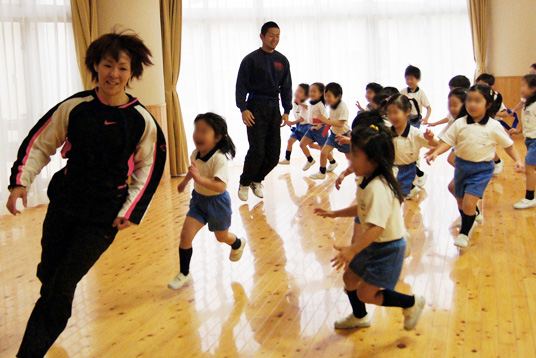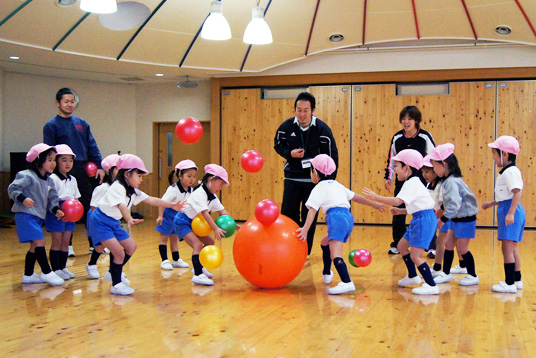幼稚園でスポーツ教室がありました 2011.01.13(木) Post 子どもたちの運動能力の基礎づくりを培い、身体を動かす楽しさを知ってもらおうと定期的に実施している課外講座のひとつ「スポーツ教室」を行いました。遊戯室で、ならスポーツネットワークの丹羽敦巳先生たちを講師に、年長組の園児たちが準備運動からスタート。ボールを使った運動や跳び箱、壁を使っての三点倒立に挑戦しました。続いて年少、年中の園児たちもボールを使った遊びや、マットの上で熊やうさぎになって、楽しく跳ねたり転がったり、それぞれの年齢に沿った運動で身体を動かし、室内は園児たちの楽しい歓声でいっぱいになりました。園児たちも、いろんな運動に挑戦することで「できたよ」「もっとできるよ」と意欲と達成感を得たようで、次年度の定期開催へのよい足がかりとなりました。 « 第34回奈良文化女子短期大学フェスティバルに出演しました カルタ大会をしました »