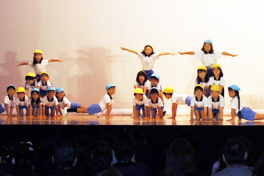 年長の5歳児たちは、元気いっぱいに歌を歌ったり、組体操「心の地図」を全員で行い、たくさんの観客の前で力いっぱいに演技をしました。会場からは大きな拍手が送られました。