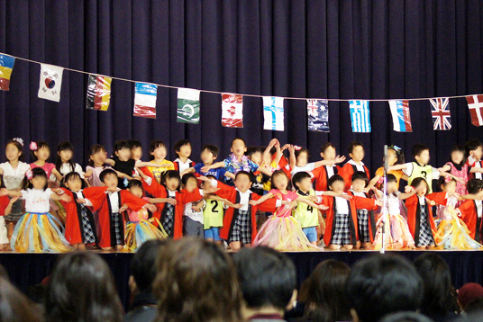 一番初めに登場したのは3歳児の園児たち。かわいいクリスマスの衣装と帽子を頭に、「サンタが町にやってくる」や「あわてんぼうのサンタクロース」などのクリスマスソングを楽しく大きな声で歌いました。続く4歳児たちは、世界の子供たちはいったいどんな様子なんだろう?と「せかいのこどもたち・ワールドチルドレン」をステージいっぱいに、ドイツやブラジル、ハワイの子供たちに扮して歌って踊りました。