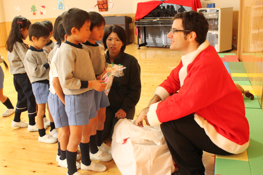 園児たちの「Santa Claus come here!!」の呼びかけに、シャンシャンシャンの鈴の音とともに、サンタクロースさんが来てくださいました。