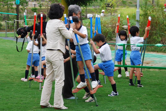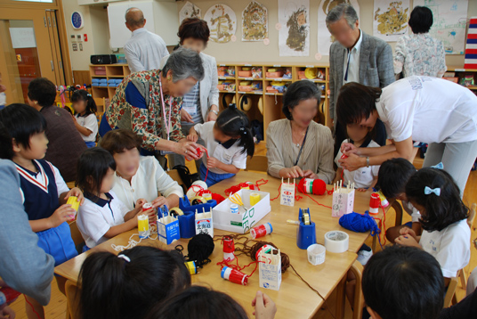 遊戯室に集まって全員で元気にご挨拶をしたあと、今日皆に昔ながらの遊びを教えてくださる”スペシャル先生”が紹介されました。スペシャル先生は園児の祖父母のみなさまでご応募くださった方々にお願い致しました。 荒井園長の挨拶のあと、子どもたちはおじいちゃん、おばあちゃんと一緒に伝承遊びのコーナーをまわりました。夏に綺麗な芝生が生えそろった園庭では、竹馬、フープや花いちもんめをして元気に遊ぶ子どもたちの姿と、それを優しく見守る姿が見られました。 また、保育室ではリリアンやあやとり、紙鉄砲など昔ながらの室内遊びをスペシャル先生に教わりました。子どもたちは初めての遊びに大喜びのようで、あやとりやコマ回しなど、とても上手にできるようになりました。