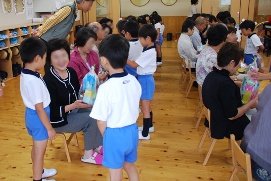 楽しい遊びのあとは、いつもの感謝の気持ちをこめて、祖父母のみなさまに歌を歌って肩しました。 最後にこの日のために一生懸命作ったプレゼントを渡すと、とても喜んでもらえて、子どもたちも嬉しそうでした。