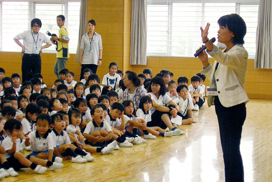 小学生が幼稚園児を招いて、七夕をお祝いする会を開きました。 体育館には願い事を書いた短冊が吊るされた笹が飾られ、3年生の司会でスタート。福永校長から「この会はみんなが主役です。みんなで頑張って、良い会にして楽しみましょう」と挨拶がありました。