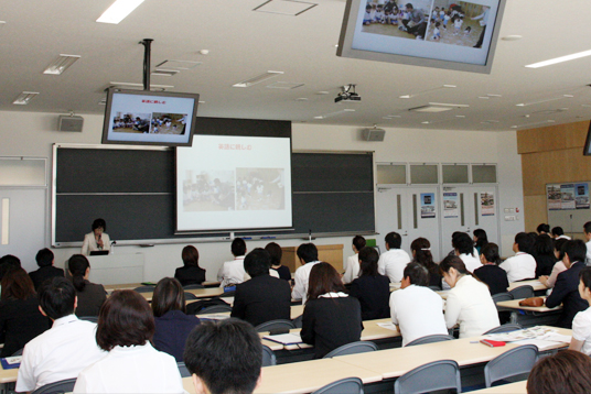 また島野恭子教頭からは、園での一日の過ごし方など、実際の園児の様子を写真を交えて紹介。先日の合同運動会や、4月に行われた『平城遷都祭』参加などについても説明しました。 施設・園庭見学では「光庭」や「遊戯室」など園内を実際にご覧いただきました。