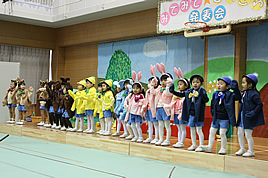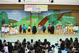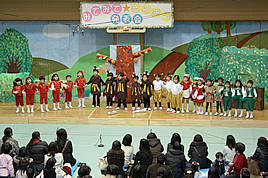 【PP】生活発表会を開催しました 2010.02.06(土) Post PPの生活発表会「第二回 みてみて・きらきら発表会」を開催しました。今年は、新たに1学年が増え、舞台も保護者席も賑わいを見せていました。年少児にとっては、初めての生活発表会でしたが、練習の成果を発揮していました。のびのびと演じ、歌う姿に、保護者の方からは大きな拍手が贈られました。2年目の発表会である年中児達は、昨年より一層練習を積み、小道具などの作成にも取り組みました。お芝居や歌など、一つの舞台を協力して作り上げる喜びを感じたようでした。 « 節分の豆まきを楽しみました 【PP・P】 マラソン大会を実施しました »