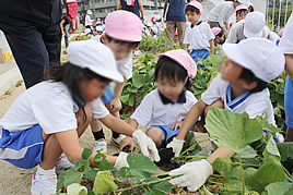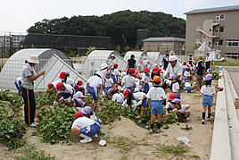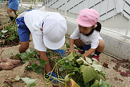 サツマイモの収穫をしました 2009.09.05(土) Post 幼稚園・小学校と合同で、PP棟の屋上菜園で栽培していたサツマイモの収穫をしました。今年は去年より葉ぶりがよく、成長も早かったため、予定を早めての収穫となりました。福永校長先生が「みんなでサツマイモをさわって、サツマイモも生きていると言うことを感じてください」と、収穫前に話をされ、掘り起こした大きなサツマイモを小学生も園児も小さな手でしっかり持って、収穫の喜びを実感している様子でした。去年より大きなサツマイモが収穫でき、1クラスだけで段ボール箱から溢れんばかりの量となりました。収穫したサツマイモは、給食やおやつとしてみんなで頂きます。 « 中国西安市訪日教育旅行視察団が来校されました 合同運動会を行いました »