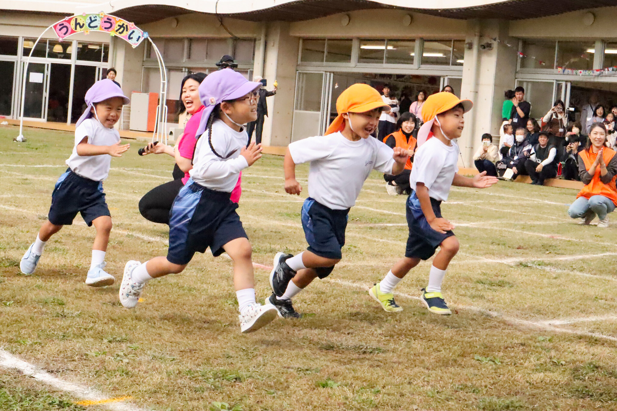 全員で歌と体操でウォーミングアップをした後は、各学年のかけっこ。