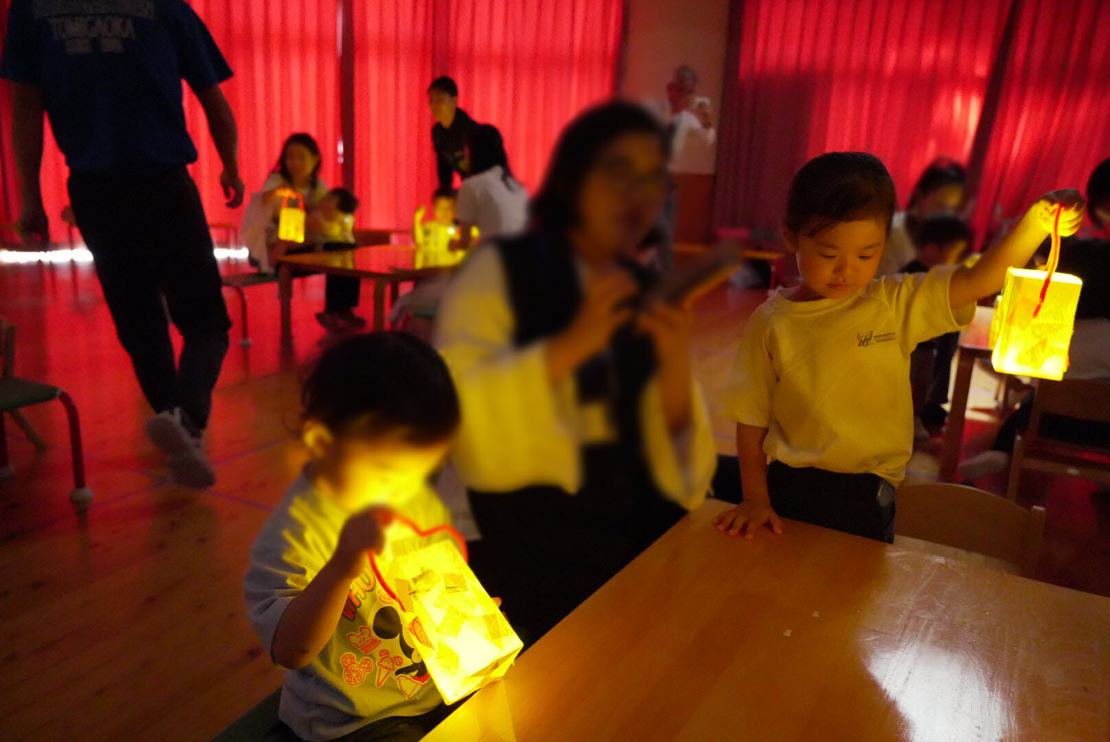 その後は、年少さんのお友だちと一緒にランタンづくりに挑戦しました。牛乳パックに好きな色のキラキラした紙をのりで貼りつけ、世界にひとつだけのランタンを完成させ、電球を入れて電気を消すと、光り輝くランタンに子どもたちは大喜びでした。