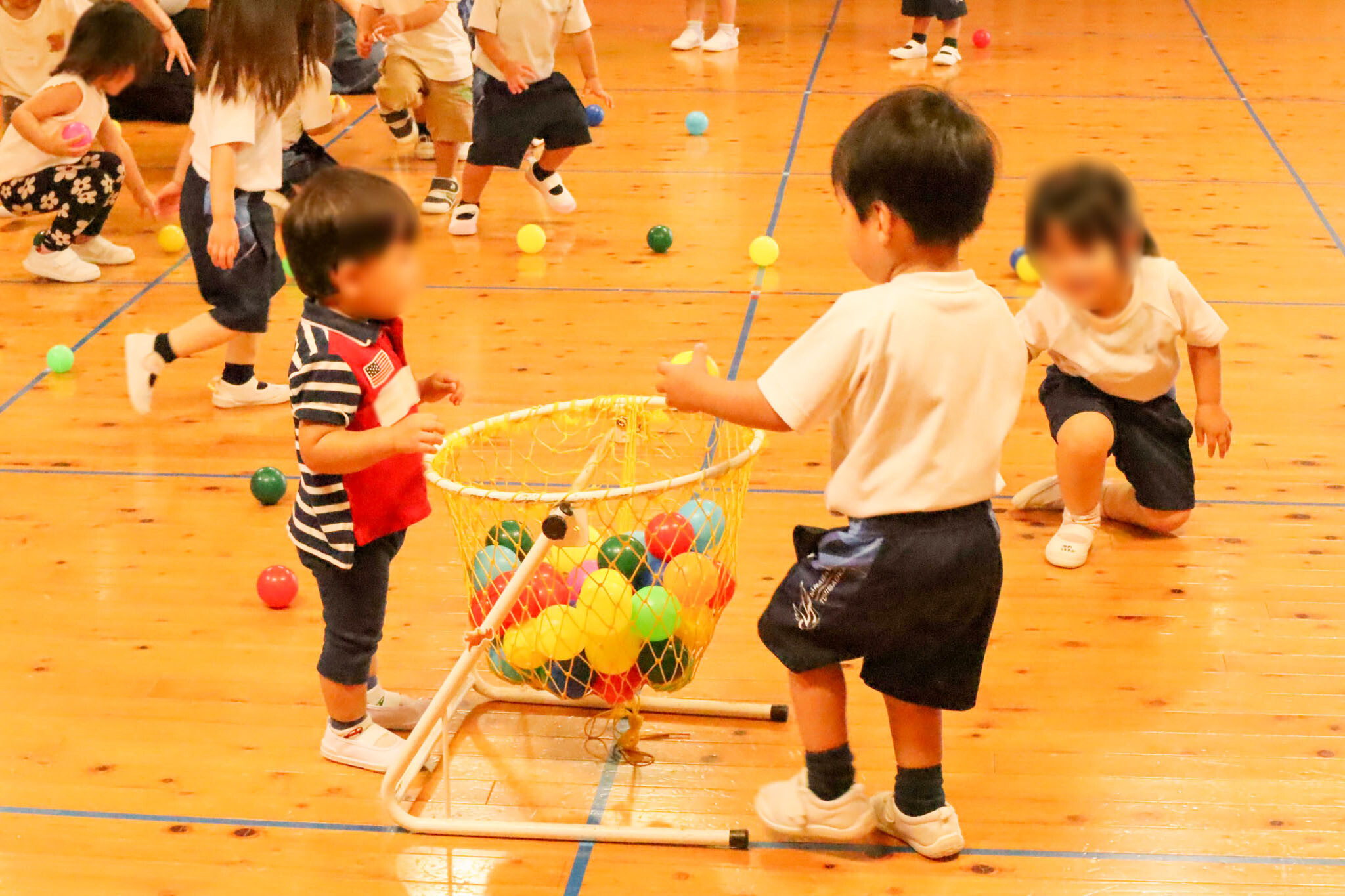 お片付けが終わると、カラーボールでの玉入れや音楽に合わせて走ったり止まったりするゲームにも挑戦し、笑顔がたくさん見られました。