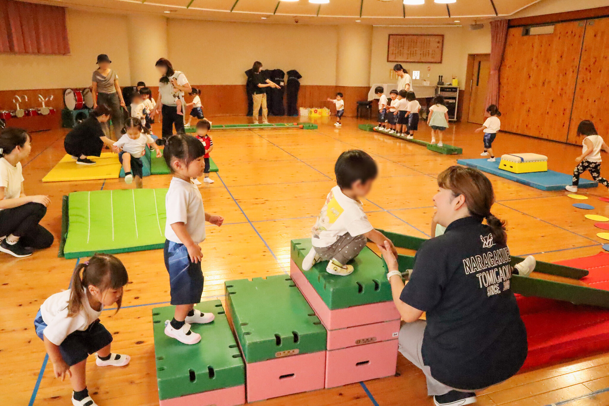 次は遊戯室に移動して、サーキット遊びに挑戦しました。マットや平均台、ブロックなどを組み合わせたコースを、全身を使って楽しみました。山登りのようにマットを登ったり、慎重に平均台を渡ったり、子どもたちの一生けんめいな姿がとても印象的でした。