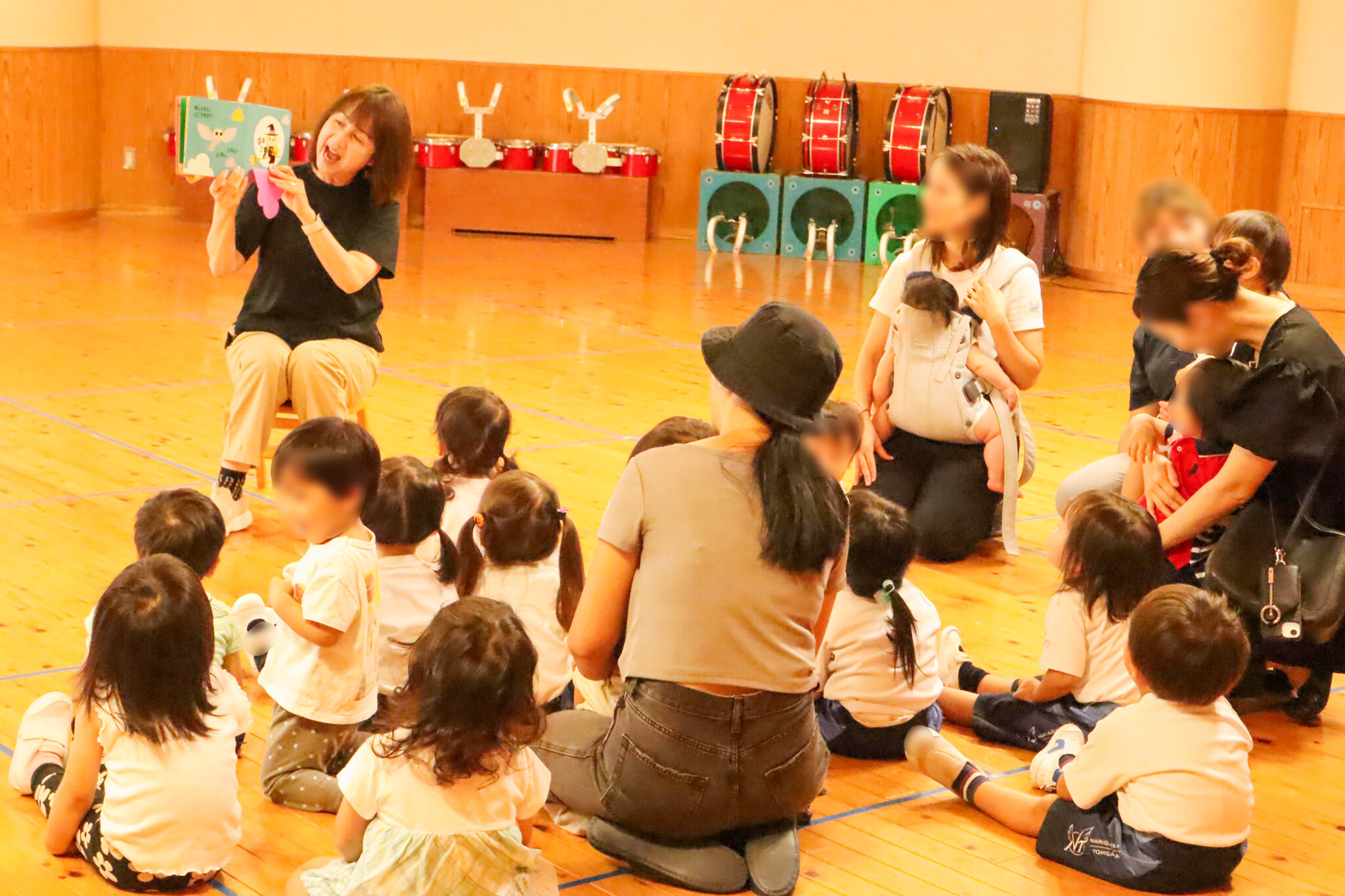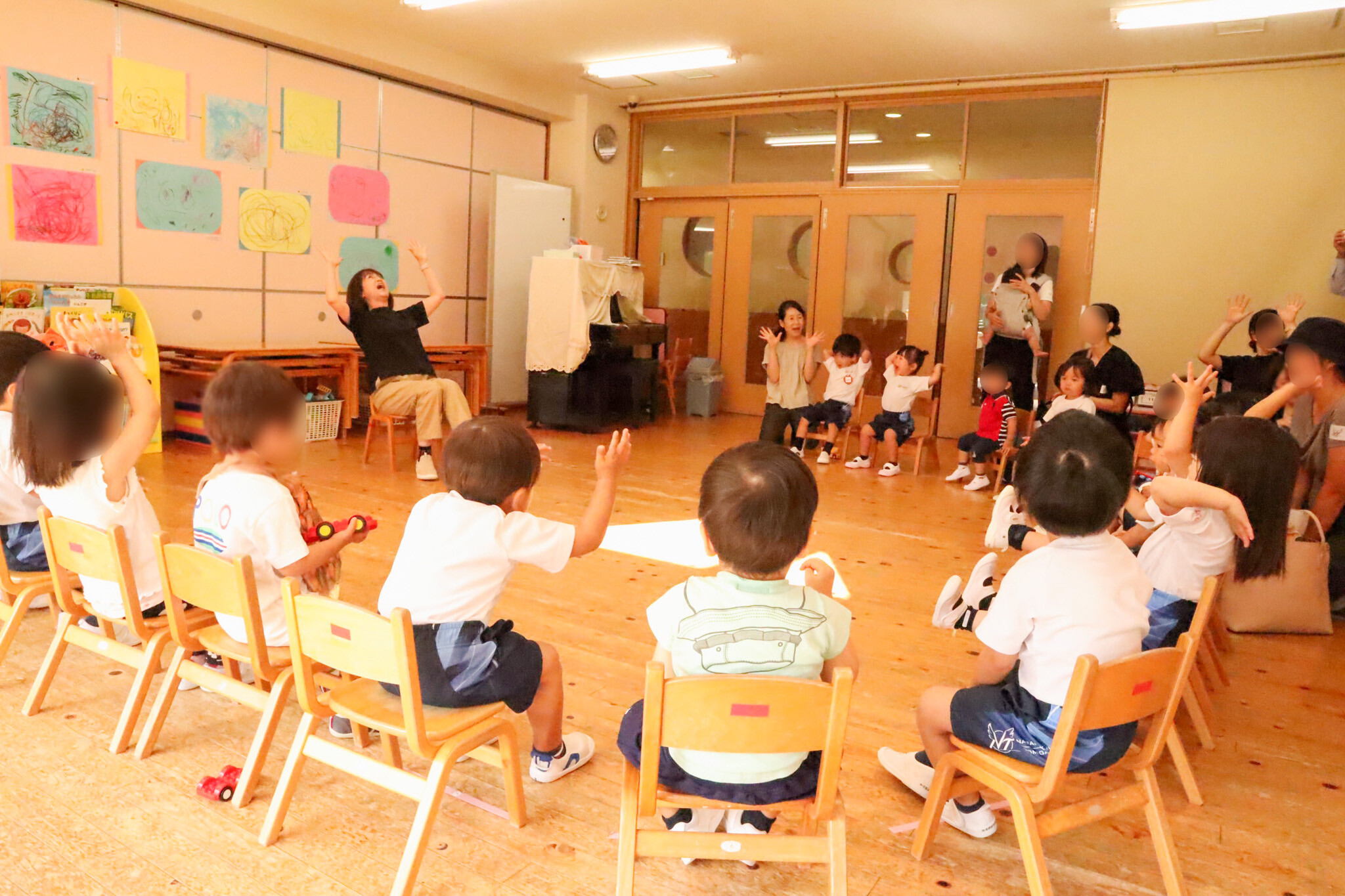まずは元気よく朝のごあいさつからスタート。初めて会うお友だち同士も、声をそろえてあいさつしているうちに、自然と笑顔があふれていました。そのあとは音楽に合わせて体を動かすリズム遊び。腕を振ったり足を動かしたり、みんなで思いきり体を動かして、にぎやかな笑い声が広がっていました。
