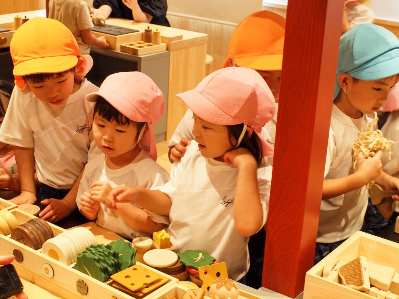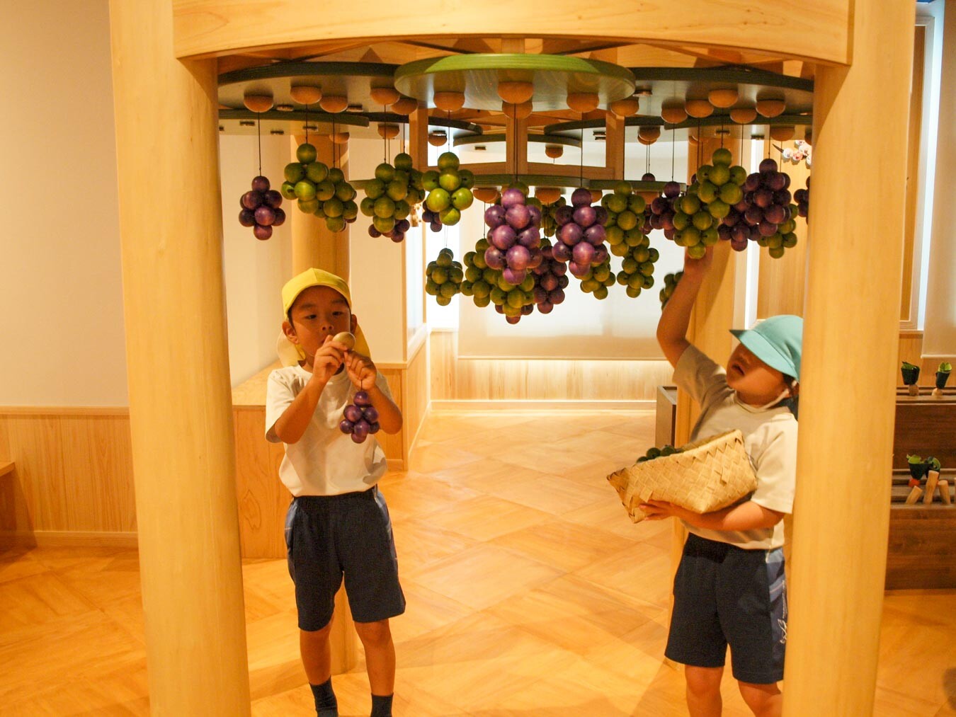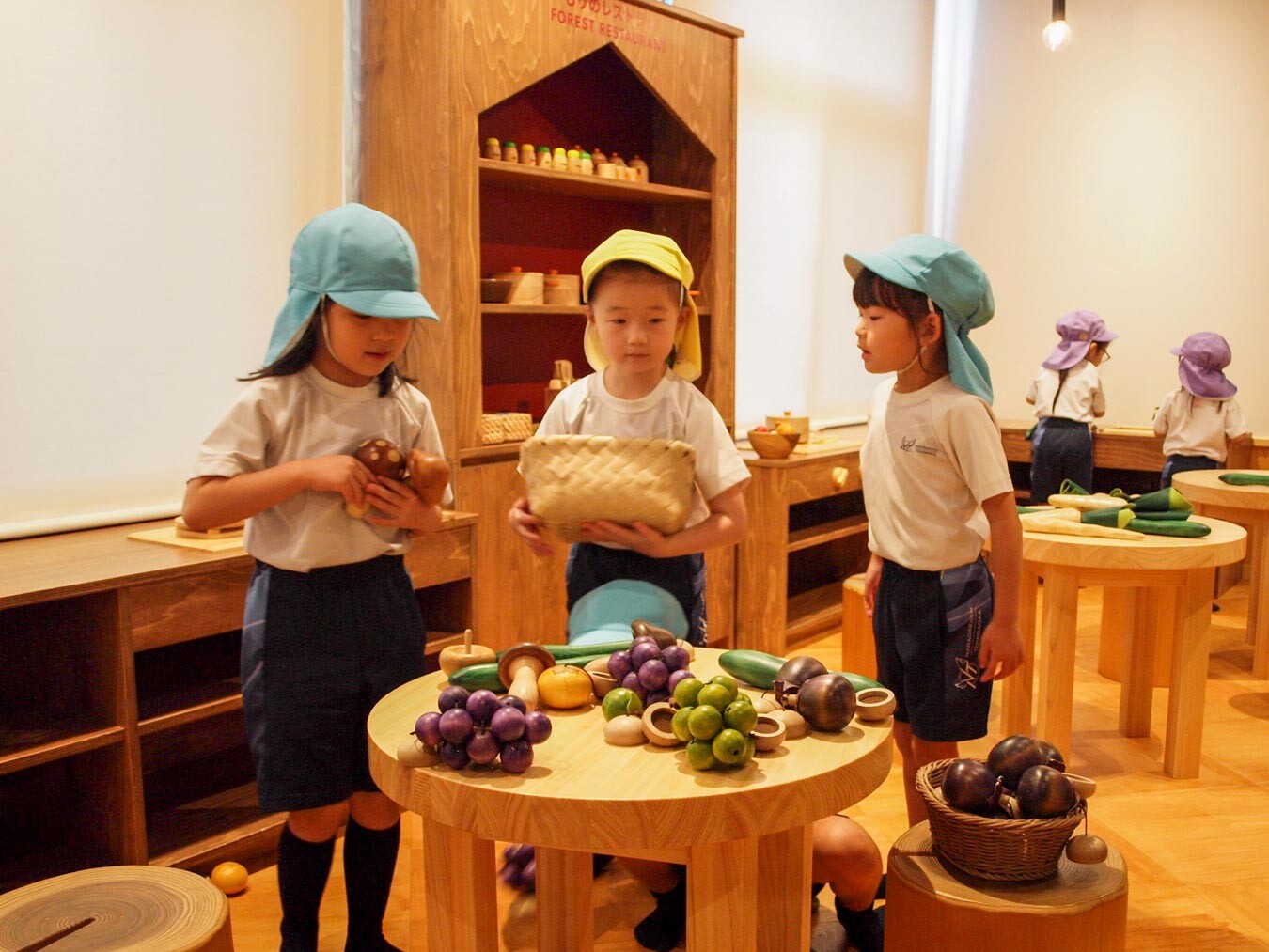 おもちゃ美術館へ秋の遠足に出かけました。館内には奈良県産の木でできたおもちゃがたくさんあり、子どもたちは目を輝かせていました。農園コーナーではブドウをカゴいっぱいに収穫し、お店屋さんコーナーではカウンターに立ち、焼うどんや分厚いお肉の鉄板焼きを作って先生にふるまうなど、思い思いに「ごっこ遊び」を楽しみました。
