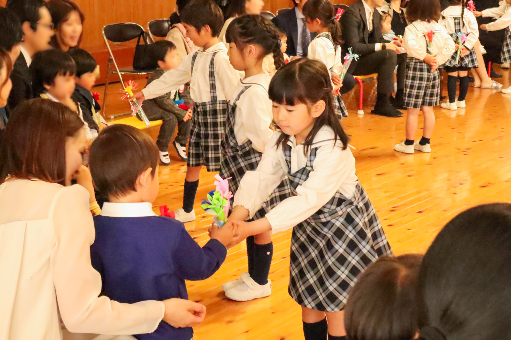 また、年長組の園児たちもお祝いに駆けつけ、「一緒に遊ぼうね」と優しい言葉を添えて歌を披露し、手作りのカラフルなお花をプレゼントしました。最後は、在園児たちが作る「ハイタッチの列」を通って退場です。
