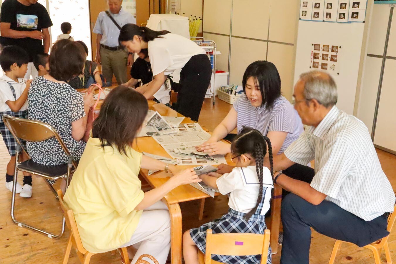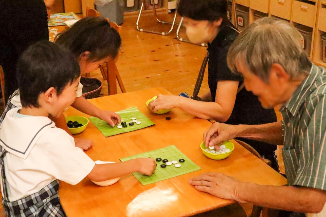 各保育室に昔遊びのブースを設け、祖父母と園児が一緒に楽しみました。囲碁やトランプ、カルタ、パズルでは、真剣な表情で取り組む園児の様子に、祖父母も自然と笑顔を見せていました。紙相撲では白熱した取り組みが繰り広げられ、紙鉄砲や折り紙も人気を集めました。園児たちは折り方を教わりながら作品を完成させ、できあがった作品を友だちと見せ合っていました。また、祖父母が披露したコマ回しやけん玉には大きな拍手が送られ、あやとりを教わった園児がさっそく友だちと技を見せ合う様子も印象的でした。