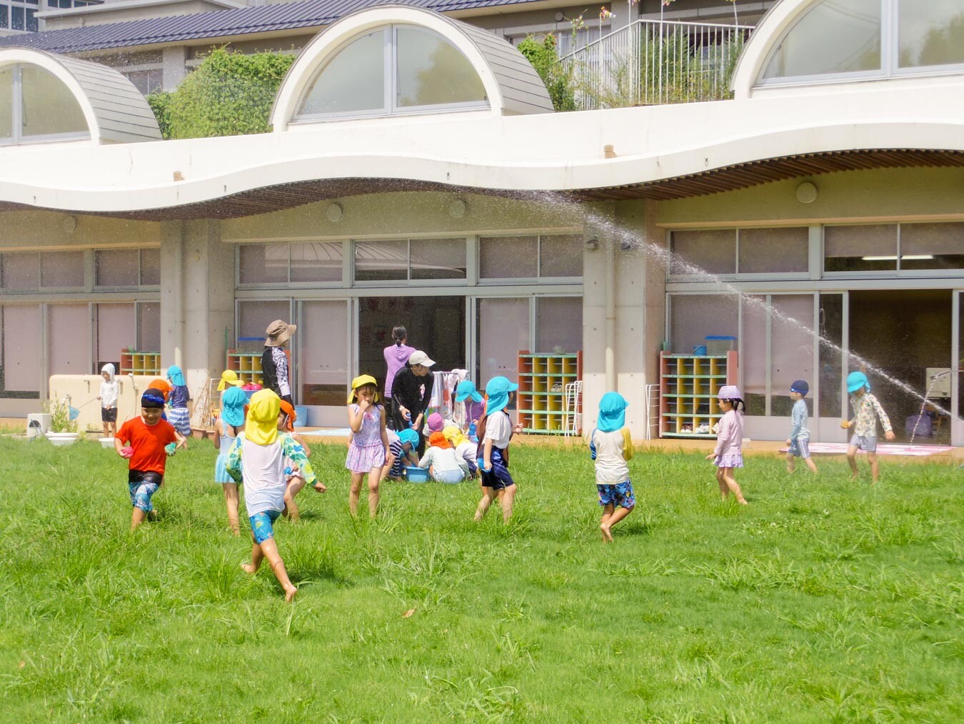 園児たちは水遊びの準備を整えて、芝生の園庭で元気いっぱいに水遊びを楽しみました。勢いよく水を噴き出すスプリンクラーに大はしゃぎ。最初は水流にそっと触っていましたが、勢いの強さに驚きながらも、だんだんと慣れて水しぶきの中を駆け回っていました。