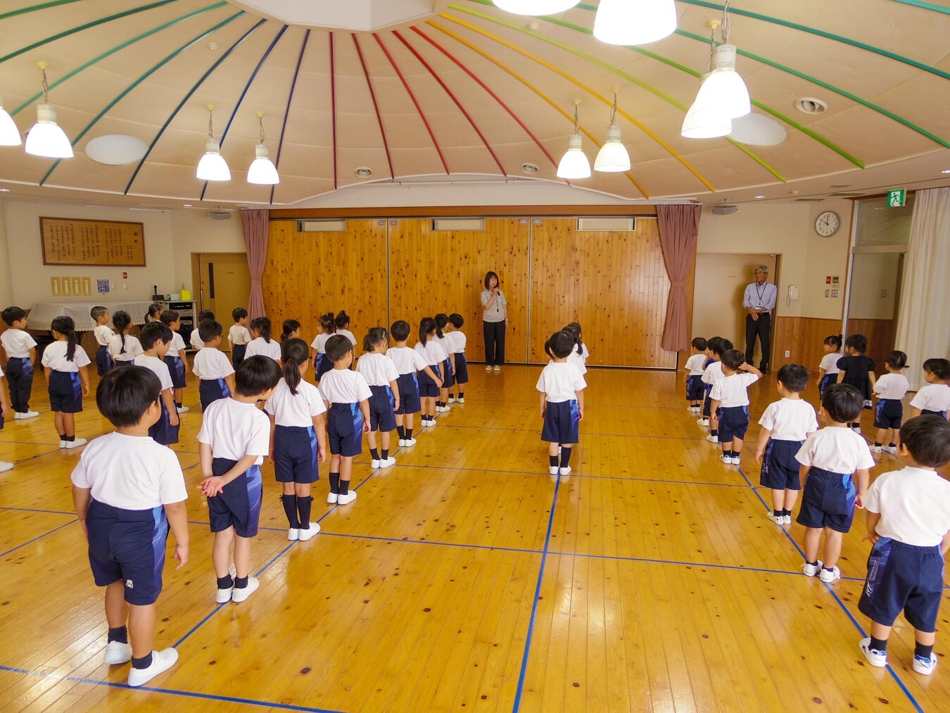 8月21日(木)、1日目の夏季保育を行いました。久しぶりに園に集まった園児たちに槇園長が「夏休みを楽しく過ごしていますか?」と呼びかけると、「はーい!」と大きな声で元気よく返事が返ってきました。