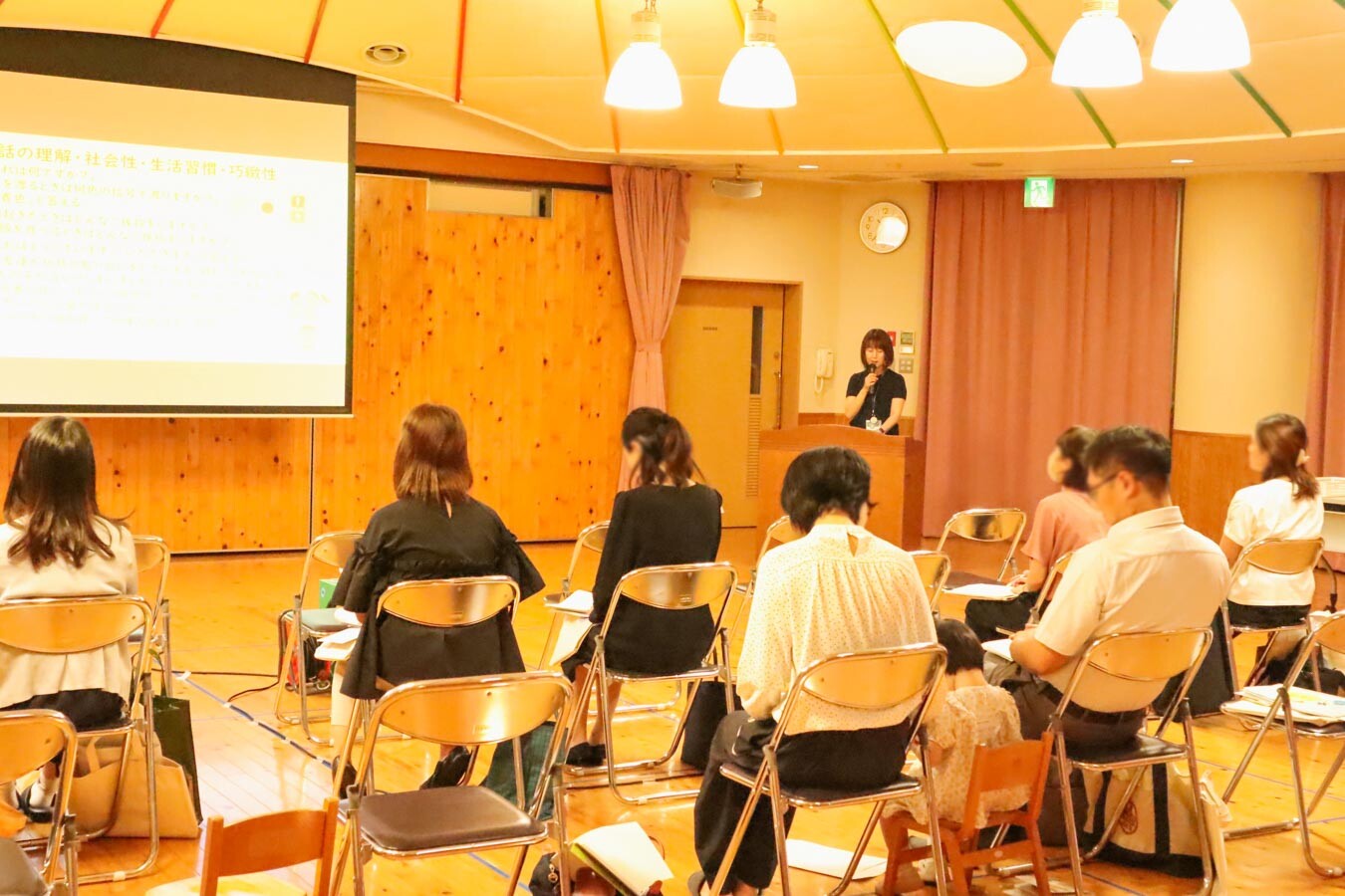 続いて益田主任からは、年間行事や日々の保育の流れ、子どもたちの成長の様子などについて、エピソードを交えながらわかりやすく紹介しました。入園を希望される方への面接や試験についても、丁寧に説明が行われました。