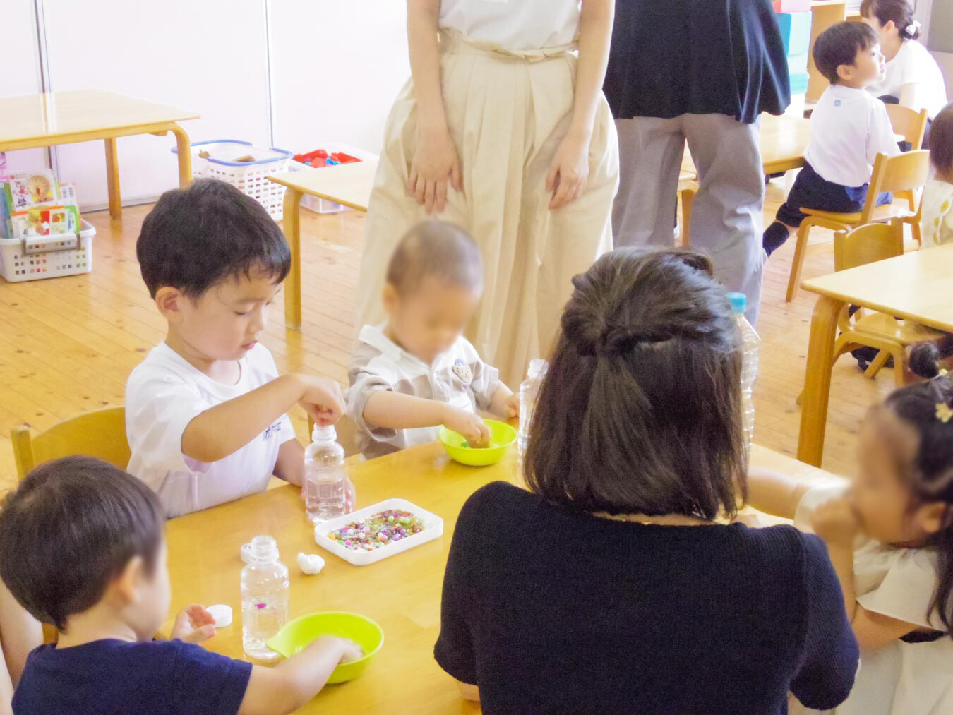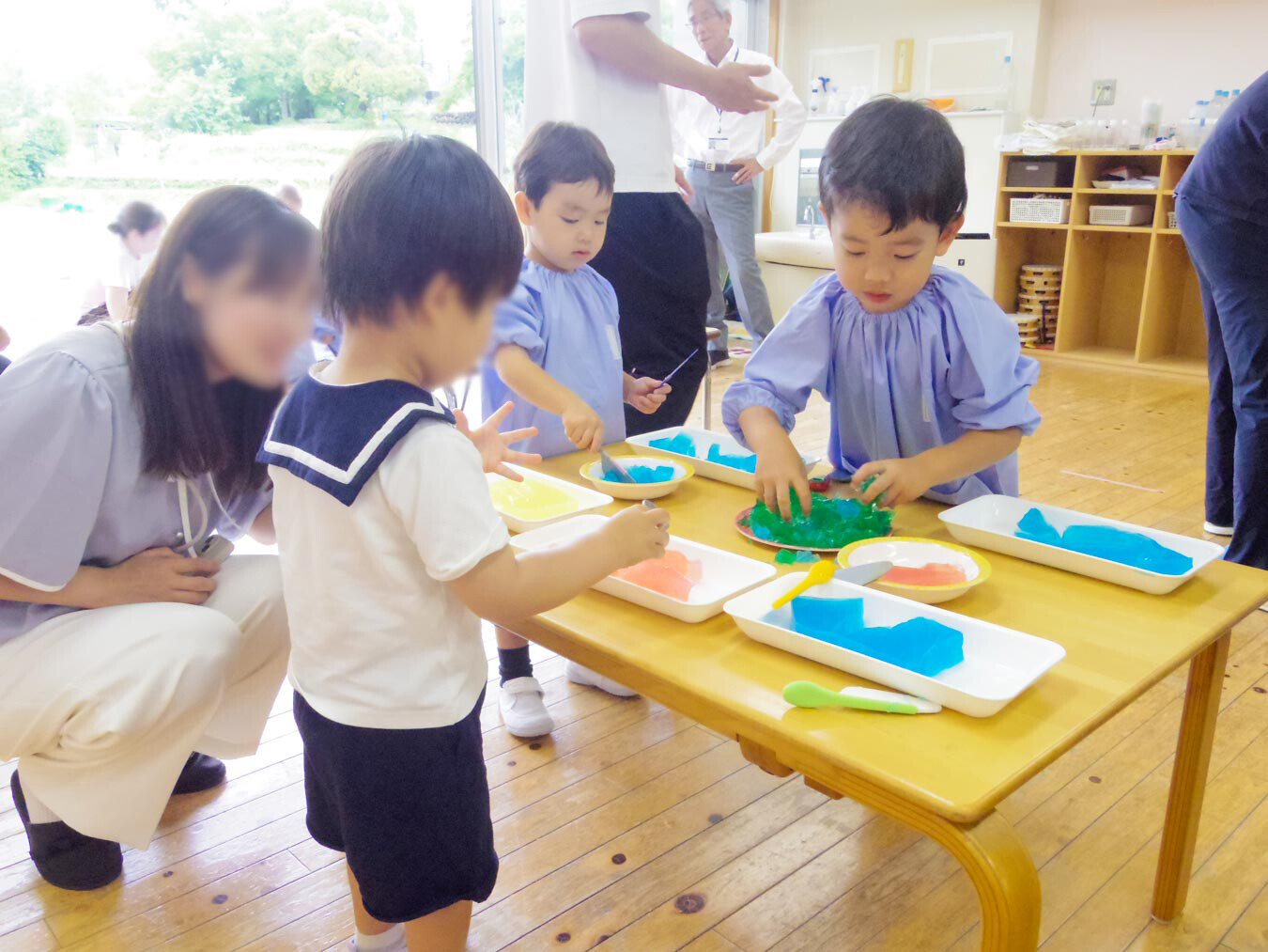 暑い季節にぴったりの遊びも取り入れました。スライム遊びでは、大きなたらいに入ったスライムを手で触って、ひんやりとした感触を楽しみました。寒天遊びでは、色とりどりの寒天をおままごとのナイフで切ったり、お玉ですくったりして遊びました。お皿にたっぷり盛りつけたり、いろんな色を重ねてきれいに並べたりする姿が見られました。