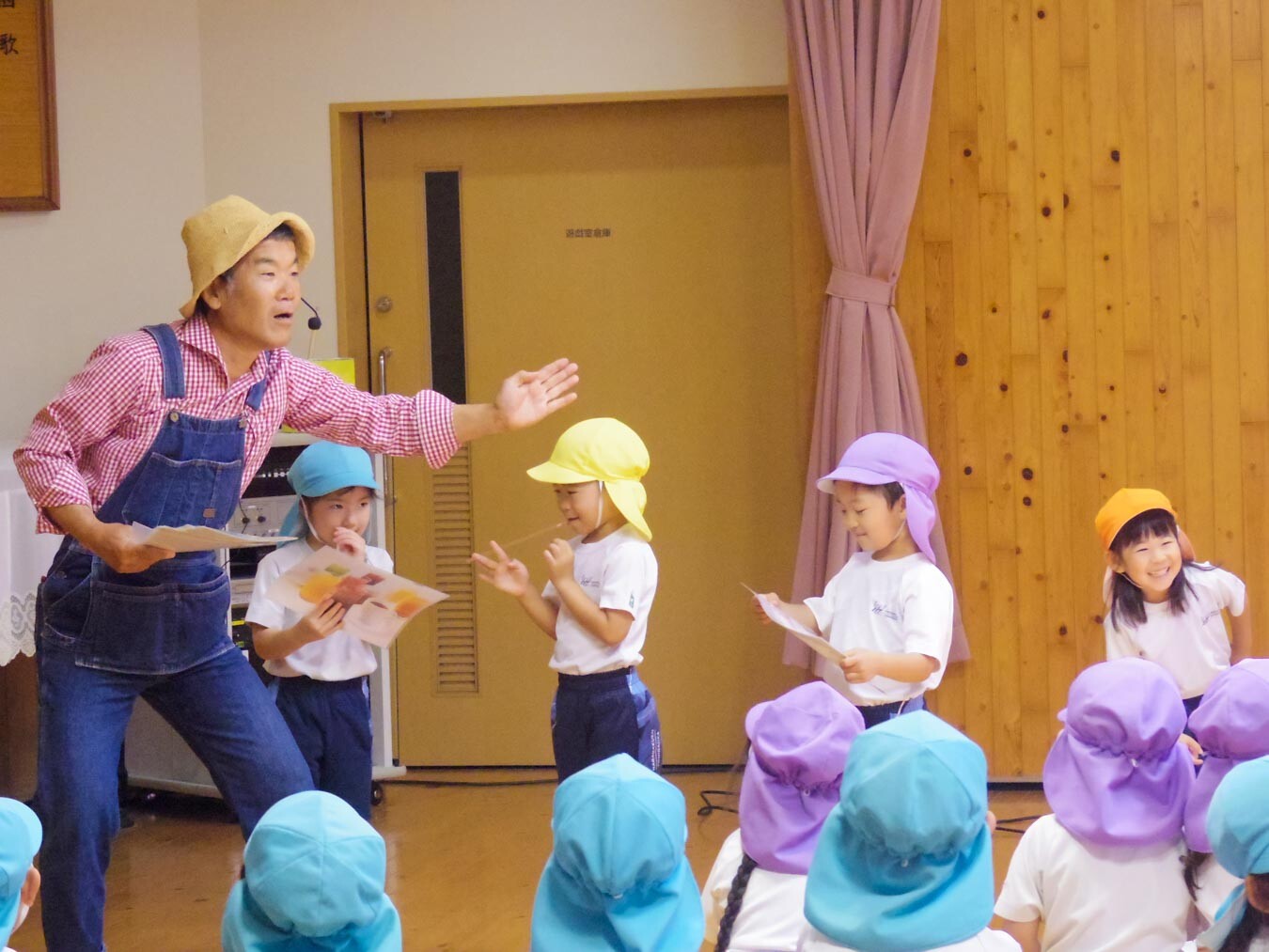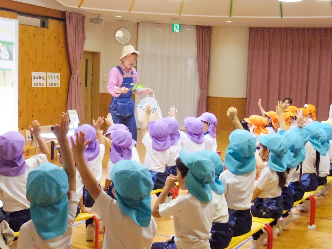 前半は遊戯室で、植物と昆虫の関係や、チョウの幼虫が成虫になると食べるものが変わることなどをお芝居を通じて楽しく学びました。はたさんがアゲハチョウが寄ってくるレモンの葉を持ってきてくださり、園児たちは葉っぱを叩いて「いい匂い」と香りを楽しんでいました。